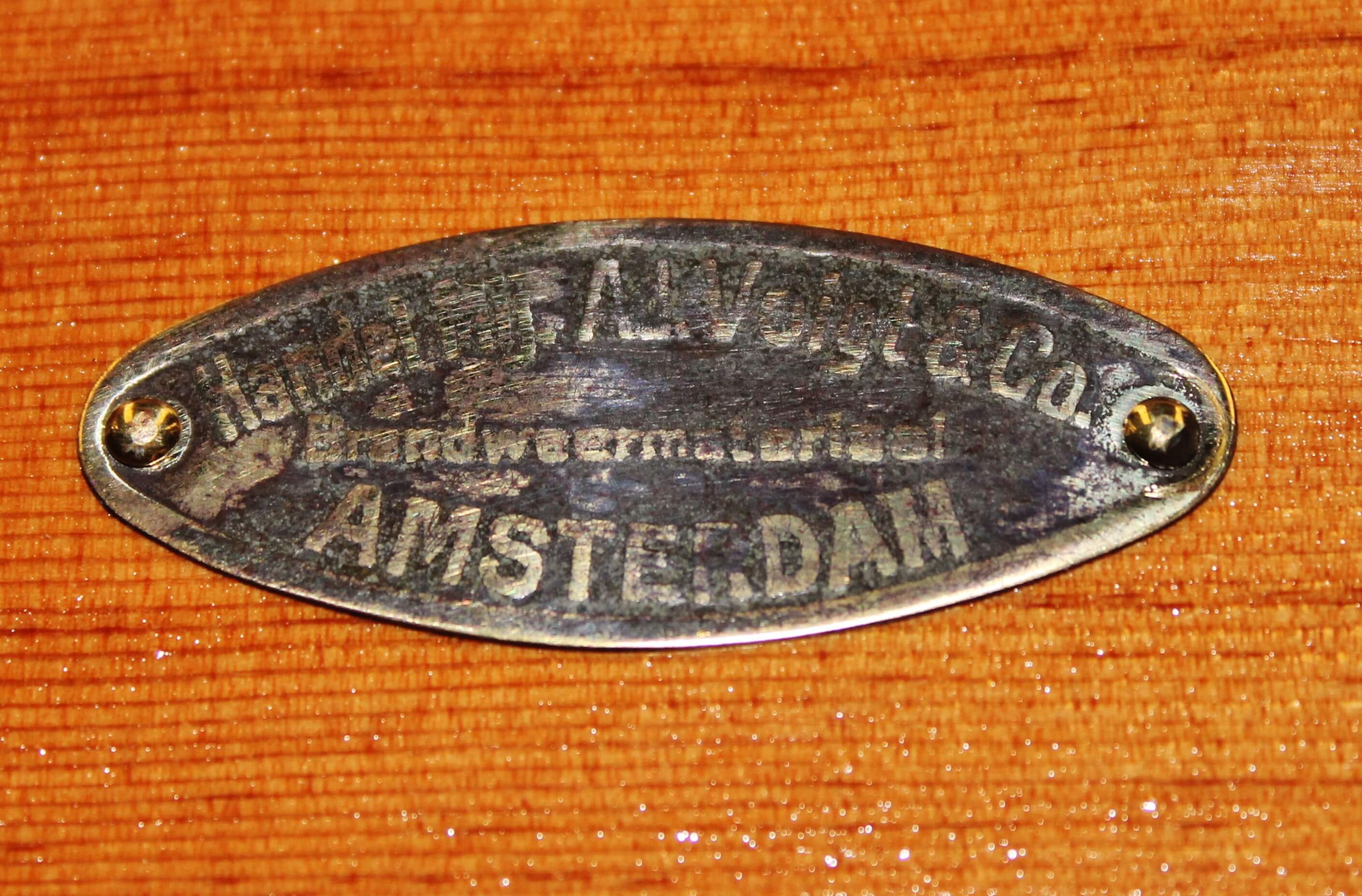 metz-ladder-koperen-vergrendeling-op-bedford-j2-ladderwagenDe achterste zwengels laten de ladder door middel van een kabelbediening uitschuiven. Een palletje dat getoucheerd wordt bij het maximaal uitschuiven van elk van de ladderdelen zorgt voor een enkele tik tegen een bel om de bediener te informeren dat verder draaien niet kan. Voor de veiligheid kan de ladder geborgd worden met koperen vergrendelingen. Helaas waren de kabels in een te slechte staat om te hergebruiken. De kabelogen wist Jan nog wel te redden en zijn daarom weer bevestigd aan de nieuwe kabels.