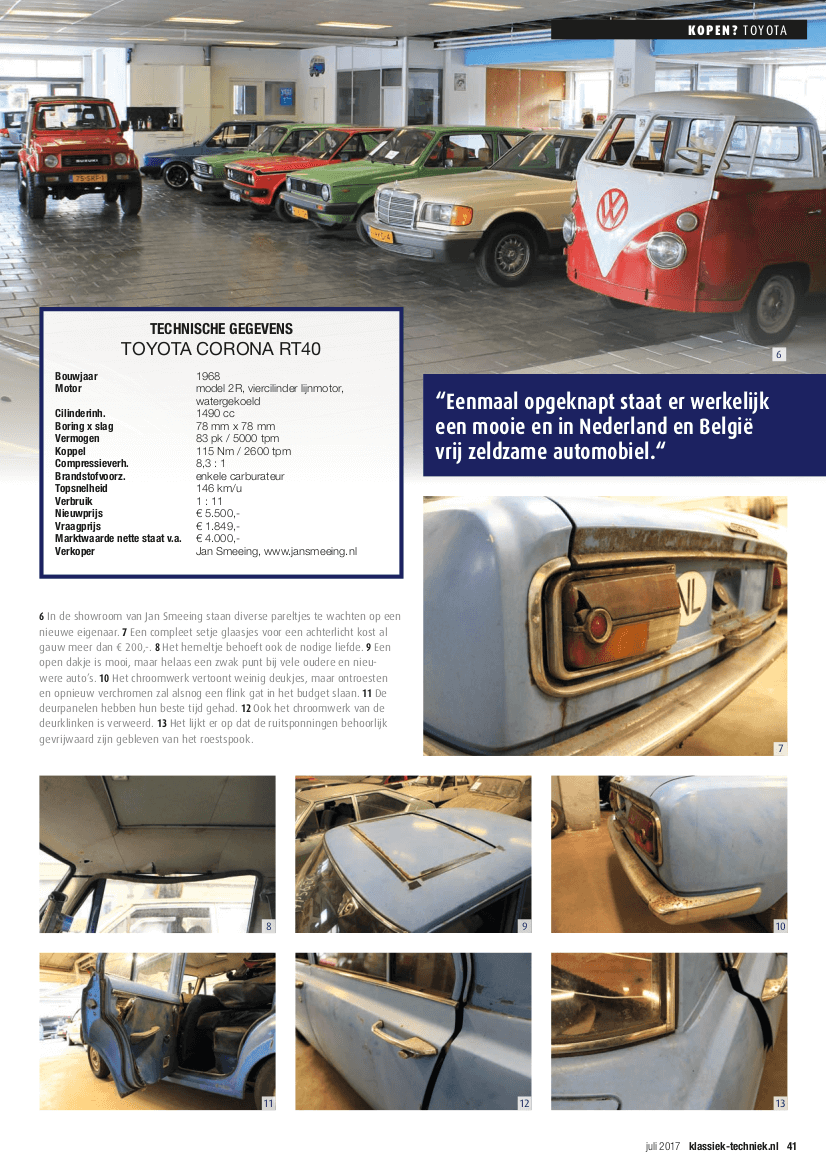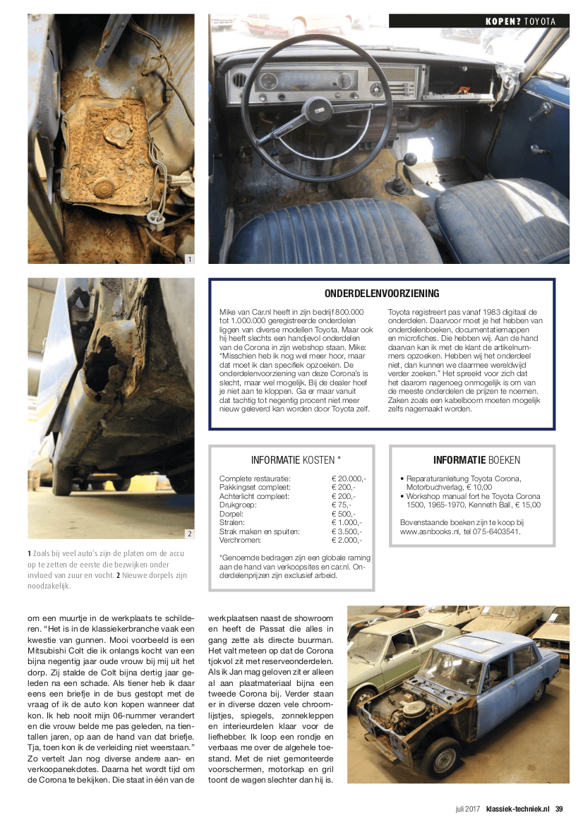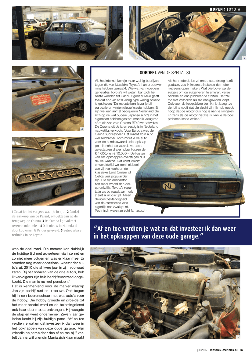 Voor mijn vaste rubriek ‘Komt een auto bij de dokter’ strijk ik neer in Soest. De jonge ondernemer Jan Smeeing bestiert in een klassiek jaren vijftig pand zijn autobedrijf. Hij specialiseert zich met name in klassiekers en doet dat vanuit een enorme passie. Je kan uren zoet zijn in zijn bedrijf. Enerzijds vanwege de vele automobielen en anderzijds om het oude gebouw te bekijken. Jan deed me tijdens het bezoek wat plannen voor de toekomst uit de doeken waar ik zeker interesse in heb om te volgen. Ik zal er in de toekomst dus nog wel vaker heen gaan. Deze keer ben ik er echter voor een origineel Nederlandse Toyota Corona RT40 uit 1968. Een opknapper uiteraard, want daar gaat deze rubriek om. De inmiddels redelijk zeldzame klassieker wacht niet alleen op een liefhebber die de tijd en moeite in de restauratie wel steken, maar ook om zijn verhaal te vertellen. Een deel van zijn verleden is te lezen in K&T232.