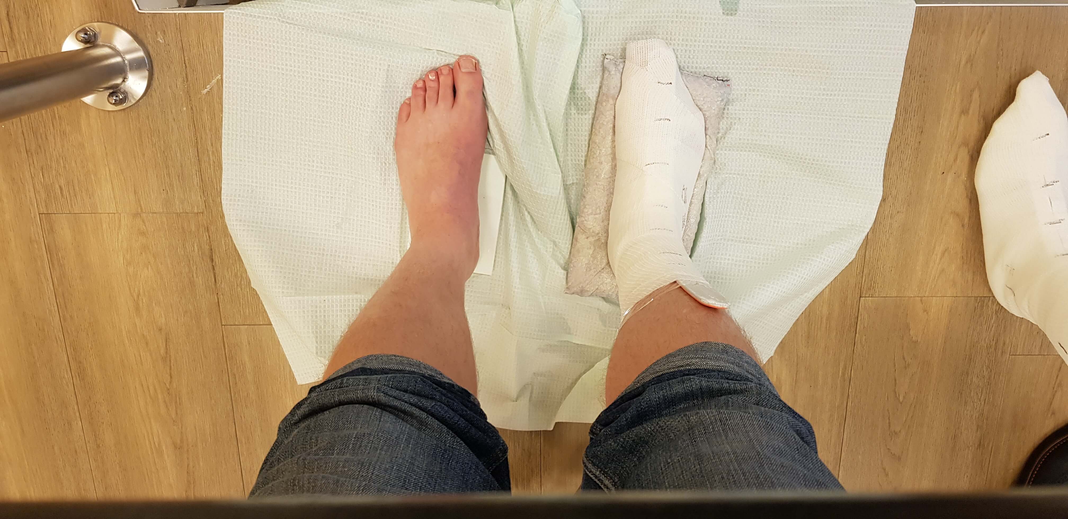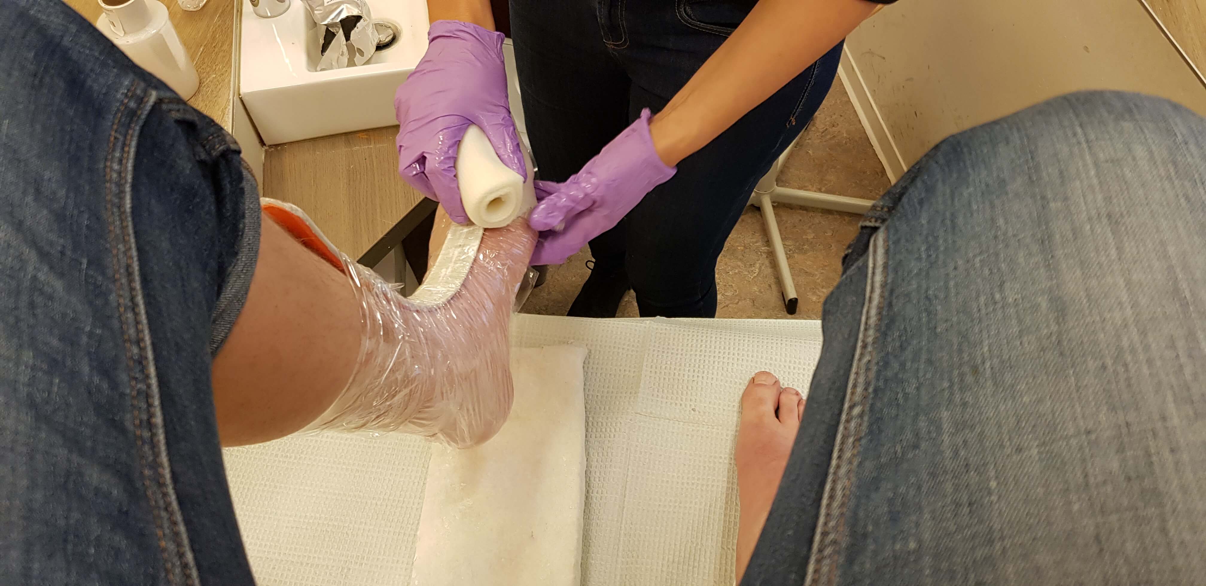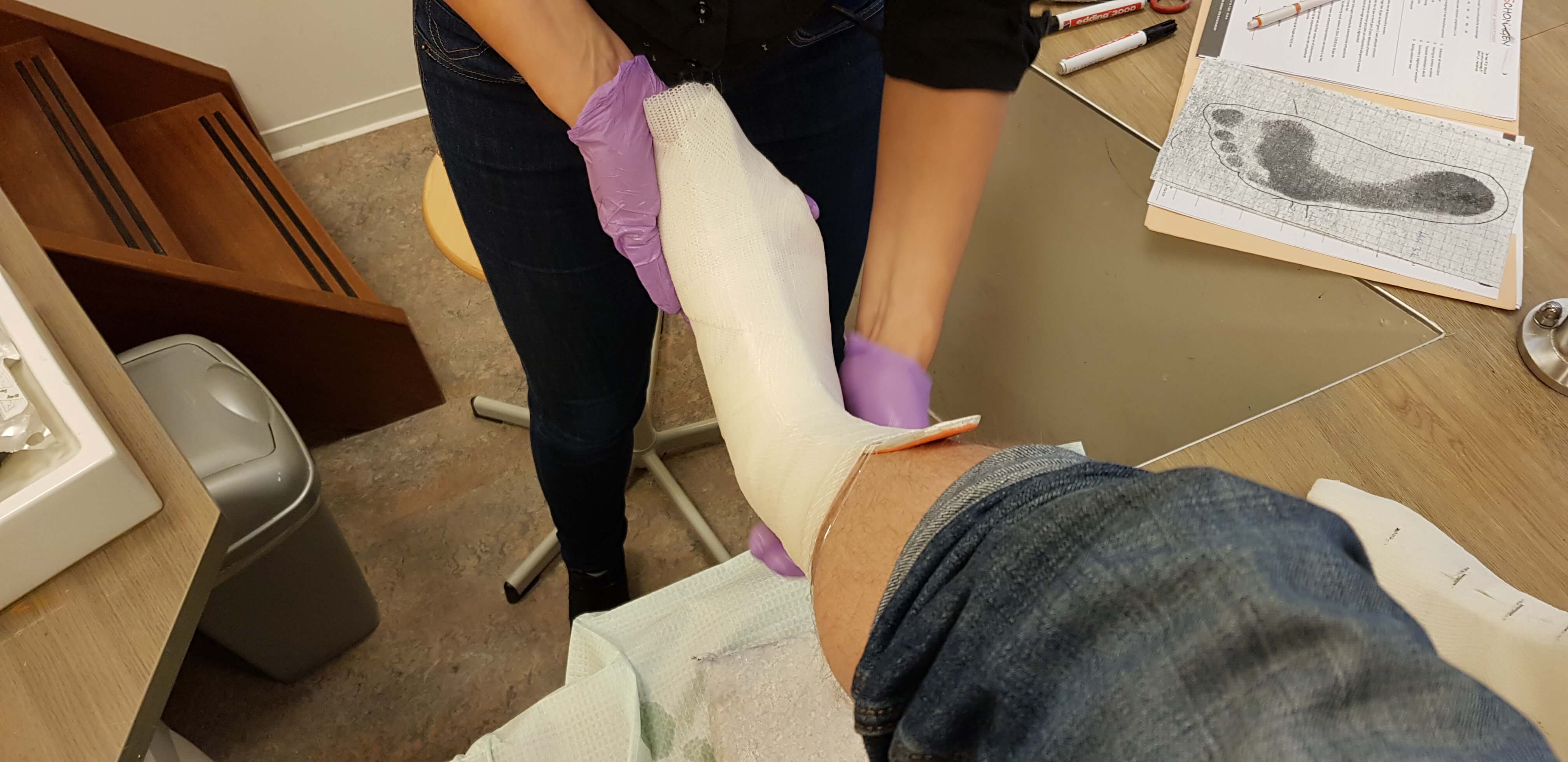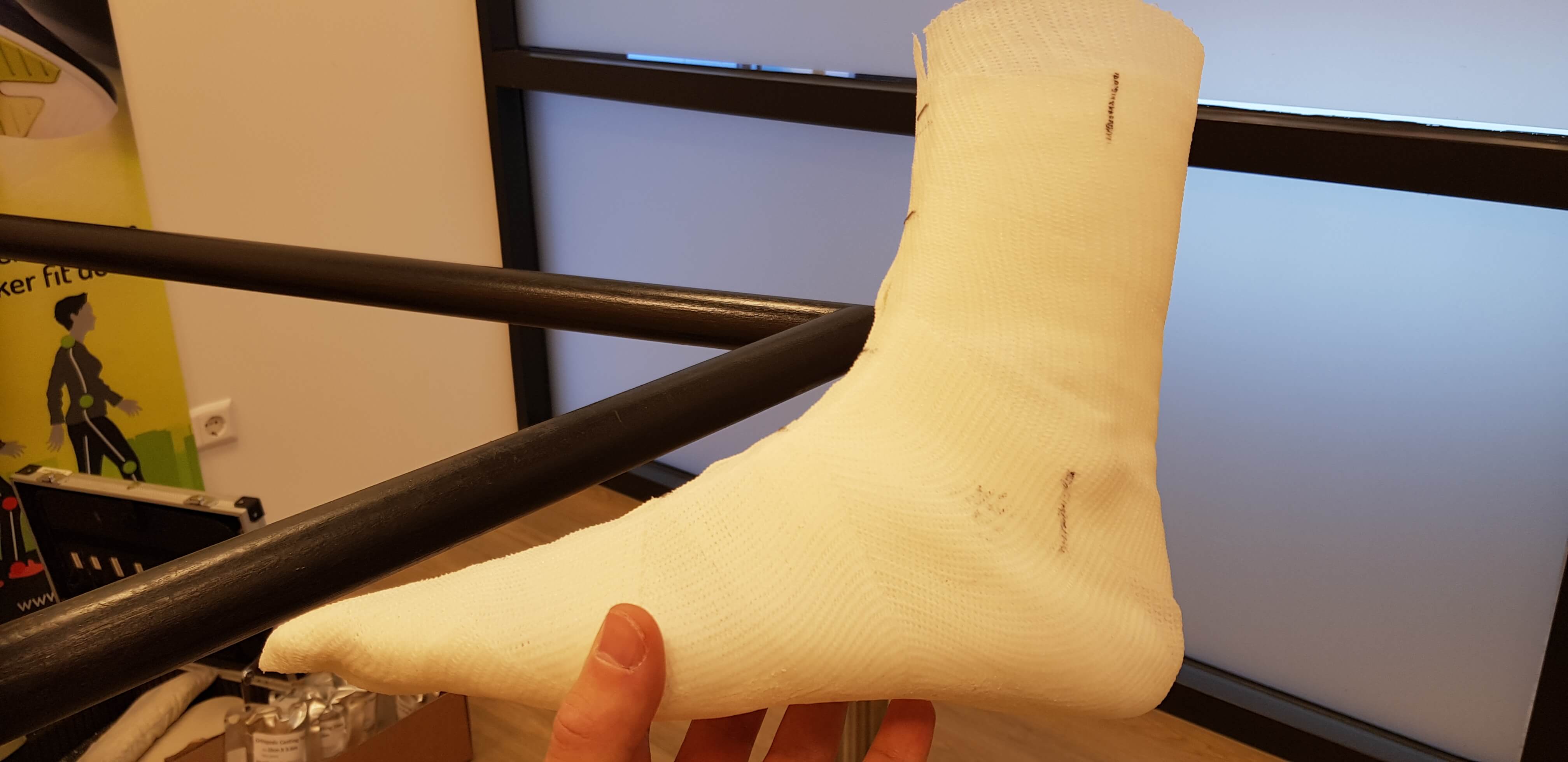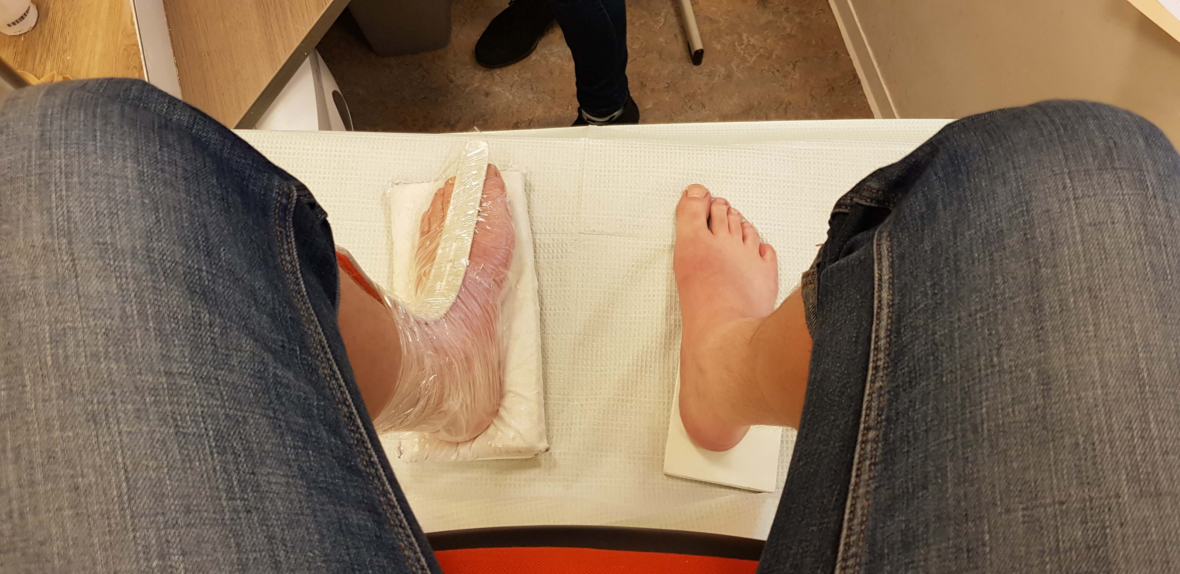 Dat vervaardigen van orthopedisch schoeisel (OSA) behelst heel wat meer dan het opmeten van de voeten voor de eerdere semi-orthopedische schoenen (OSB). Allereerst moesten er gipsafdrukken gemaakt worden die als mal dienden voor mijn leesten. De leesten vormen als het ware een kopie van mijn voeten. Wie ze wel eens gezien heeft, kan zich vast niet voorstellen dat iemand mijn Hobbit-voeten wil reproduceren, maar het doel heiligt de middelen. Dus ondanks dat ik er niet specifiek een uitmuntende prestatie voor leverde, mocht ik een wit voetje halen. Bij het gipsen kon ik ook de gewenste hakhoogte aangeven, zodat de voet meteen in de juiste stand staat.