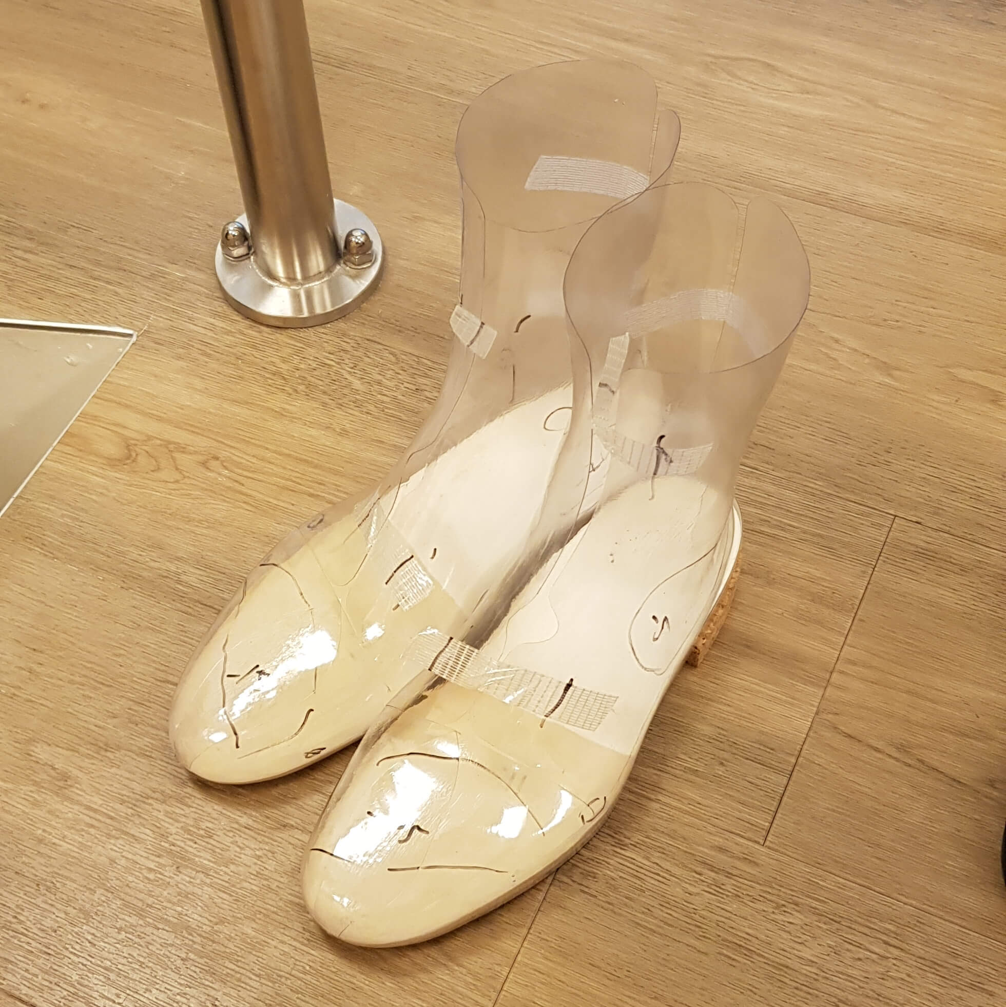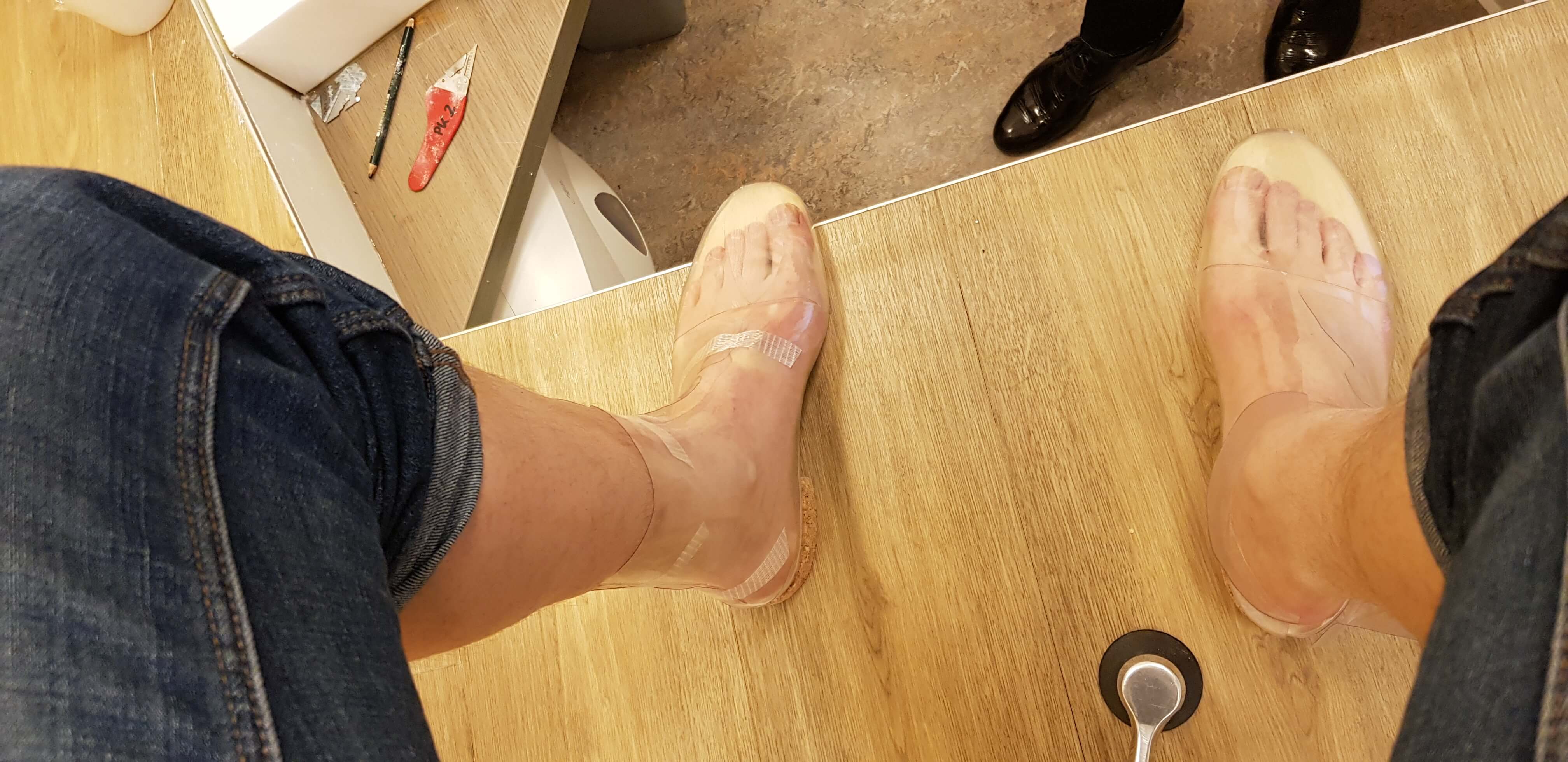 Zeker bij een allereerste paar schoenen, wil je zeker zijn dat de aanpassingen kloppen. Daarom mocht ik me na een week of twee als een mannelijke Assepoester melden bij Hilde. Ze had een soort glazen muiltjes gemaakt. Officieel heten die folieschoenen, doorzichtige schoenen waardoor Hilde de passing nauwkeurig kon controleren. Eventuele drukplekken of andere onvolkomenheden kon ze daarna op de leest nog aanpassen.
